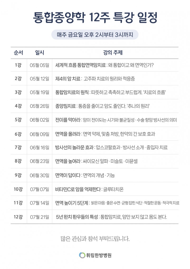 [공지사항] 통합면역암치료 12주 특강 일정 안내